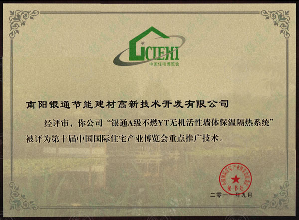 南陽銀通節(jié)能建材高新技術(shù)開發(fā)有限公司 經(jīng)評審,你公司“銀通A級不燃YT無機活性墻體保溫隔熱系統(tǒng)”被評為第十屆中國國際住宅產(chǎn)業(yè)博覽會重點推廣技術(shù)。 中國國際住宅產(chǎn)業(yè)博覽會組委會 秘書處 二零一一年九月 第十屆中國國際住宅產(chǎn)業(yè)博覽會重點推廣技術(shù)