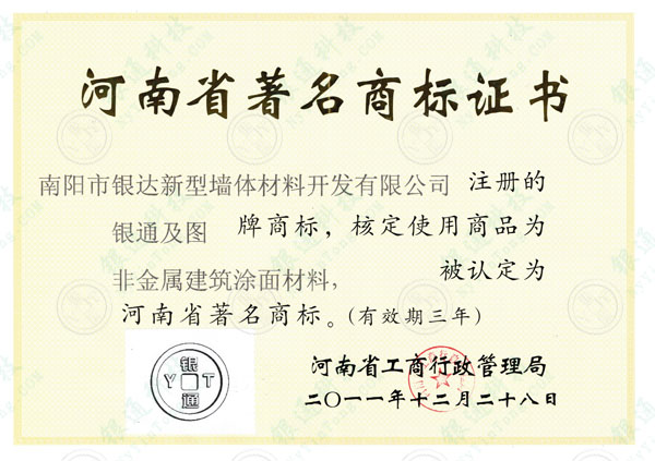 注: 此證書有效期三年,目前已失效,本介紹頁僅為方便用戶了解企業(yè)歷史資質(zhì),望悉知 河南省著名商標證書 南陽市銀達新型墻體材料開發(fā)有限公司 注冊的銀通及圖(銀通·YT)牌商標,核定使用商品為非金屬建筑涂面材料,被認定為河南省著名商標。(有效期三年) 河南省工商行政管理局 二〇一一年十二月二十八日