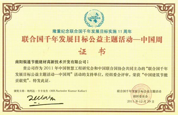 聯合國千年發展目標公益主題活動組織委員會 隆重紀念聯合國千年發展目標實施11周年 授予:南陽銀通節能建材高新技術開發有限公司 中國建筑節能貢獻獎