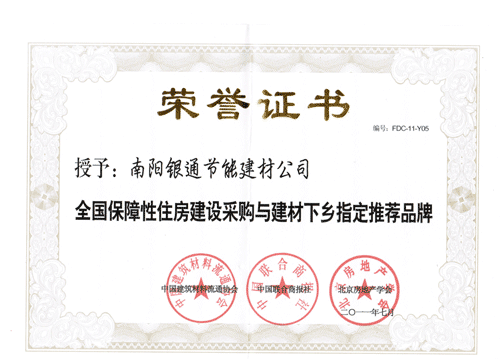 2011年7月17-18日在釣魚臺國賓館、天壇飯店召開“中國房地產50人論壇2011北京夏季峰會——產業轉型與融資戰略高層研討會”上,中國建筑材料流通協會,中國聯合商報社和北京房地產學會聯合發布,授予南陽銀通節能建材公司全國保障性住房建設采購與建材下鄉指定推薦品牌!