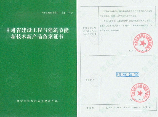 甘肅省建設工程與建筑節能新技術新產品備案證書 有效期:2011年10月13日 至 2014年10月13日