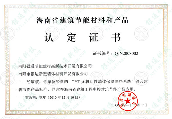 此證書為歷年曾獲證書,本介紹頁僅為方便用戶了解查詢企業歷史資質,望悉知 海南省建筑節能產品核準證書 有效期兩年,截至日期 2010年12月10日