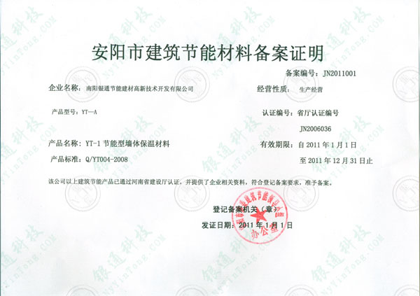 河南省安陽市建筑節(jié)能材料備案證明 備案編號(hào)JN2011001企業(yè)名稱南陽銀通節(jié)能建材高新技術(shù)開發(fā)有限公司 規(guī)格型號(hào)YT-A 認(rèn)證編號(hào)省廳認(rèn)證編號(hào)JN2006236 產(chǎn)品名稱YT-1節(jié)能型墻體保溫材料 有效期至2011年12月31日 該公司以上建筑節(jié)能產(chǎn)品已通過河南省建設(shè)廳認(rèn)證 并提供了企業(yè)相關(guān)資料 符合登記備案要求 準(zhǔn)予備案 登記備案機(jī)關(guān) 安陽市建委建筑節(jié)能領(lǐng)導(dǎo)小組辦公室 發(fā)證日期2011年1月1日