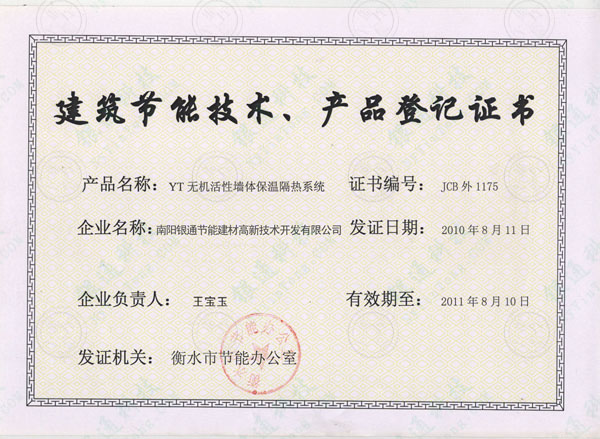 河北衡水市建筑節能技術產品登記證書 產品名稱 YT無機活性墻體保溫隔熱系統 證書編號JCB外1175 企業名稱南陽銀通節能建材高新技術開發有限公司發證日期2010年8月11日有效期至2011年8月10日發證機關衡水市節能辦公室 河北衡水市建筑節能技術產品登記證書