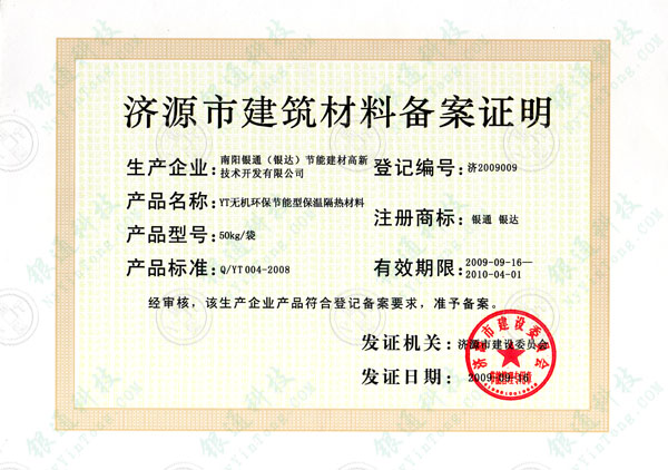 河南省濟源市建筑材料備案證明 備案編號濟2009009 企業(yè)名稱南陽銀通節(jié)能建材高新技術開發(fā)有限公司 南陽市銀達新型墻體材料開發(fā)有限公司 產(chǎn)品名稱YT無機環(huán)保節(jié)能型墻體保溫材料 規(guī)格型號YT-A 產(chǎn)品型號50kg/袋注冊商標銀通 銀達 產(chǎn)品標準Q/YT004-2008 有效期限2009年9月16日至2010年4月1日 經(jīng)審核,該生產(chǎn)企業(yè)產(chǎn)品符合登記備案要求 準予備案 發(fā)證機關濟源市建設委員會 濟源市建設委員會節(jié)能管理專用章