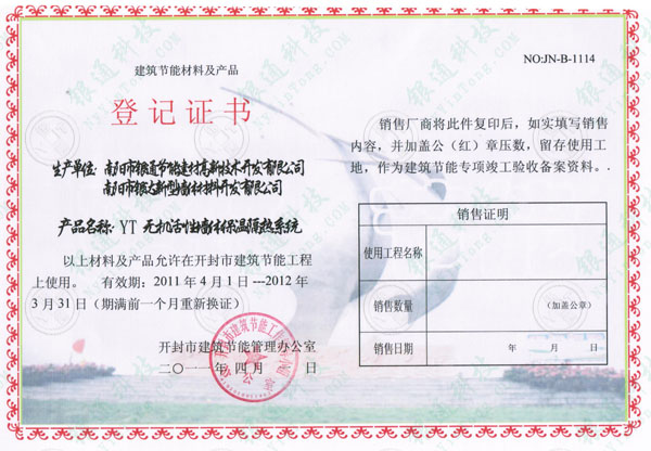 河南省開封市建筑節(jié)能材料及產(chǎn)品登記證書 備案編號NOJN-B-1114 生產(chǎn)單位南陽銀通節(jié)能建材高新技術開發(fā)有限公司 南陽市銀達新型墻體材料開發(fā)有限公司 產(chǎn)品名稱YT無機活性墻體保溫隔熱系統(tǒng) 以上材料及產(chǎn)品允許在開封市建筑節(jié)能工程上使用 有效期2001年4月1日至2012年3月31日 期滿前一個月重新?lián)Q證 開封市建筑節(jié)能管理辦公室