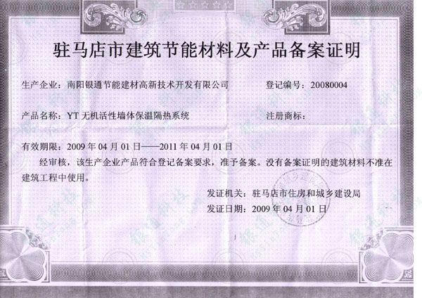 河南省駐馬店市建筑節能材料及產品備案證書 企業名稱 南陽市銀達新型墻體材料開發有限公司南陽銀通節能建材高新技術開發有限公司 單位地址 南陽市機場南路312國道西側 產品名稱YT無機活性墻體保溫隔熱系統 系統類別無機活性墻體保溫隔熱系統 證書編號20080004 有效期限至2011年4月1日 注冊商標銀通 銀達 經審核,該生產企業產品符合登記備案要求 準予備案沒有備案證明的建筑材料不準在建筑工程中使用 發證機關駐馬店市住房和城鄉建設廳 發證日期2009年4月1日