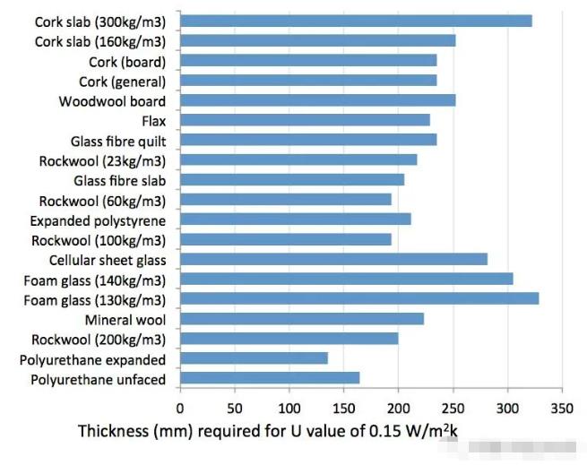 因為不同的保溫材料導熱系數不一樣,達到相同的保溫效果下,厚度也會不一樣。展示給大家的第一個圖片,是達到0.15W/(m2.K)下,不同保溫材料的厚度情況。這里假設了一種環境,即除了保溫材料不一樣,其他的基層構造都一樣。