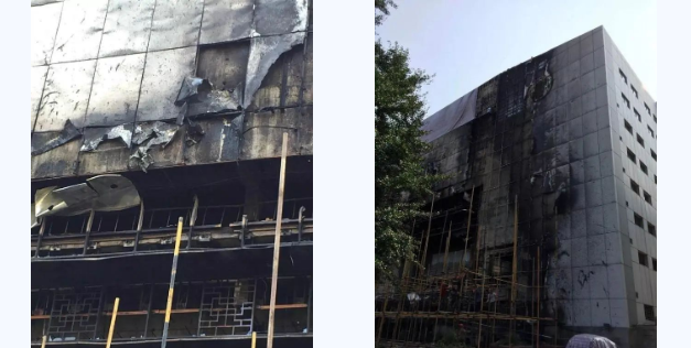 比如2018年2月1日鄭州綠地原盛國際辦公樓分別發生鋁塑板幕墻著火,3號樓的南側半面、整個東側被燒的一塌糊涂,北側也有部分過火。火舌所到之處,30mm厚的擠塑板與鋁塑板一同化為烏有。