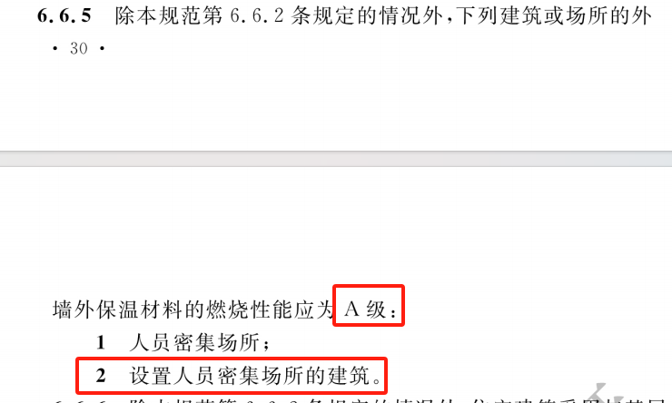6.7.4 設置人員密集場所的建筑,其外墻外保溫材料的燃燒性能應為A級。