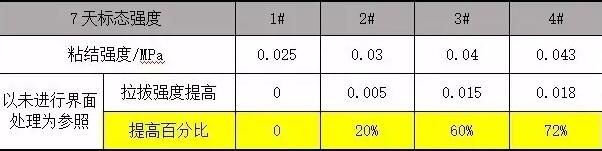 經(jīng)過7天后,測試標(biāo)態(tài)強(qiáng)度,:其中乳液+水泥+砂子的強(qiáng)度最大,乳液+水泥的強(qiáng)度次之,兩者都大于純?nèi)橐航缑鎰┨幚砗蟮膹?qiáng)度,未做界面處理的強(qiáng)度最低。