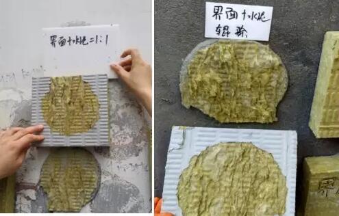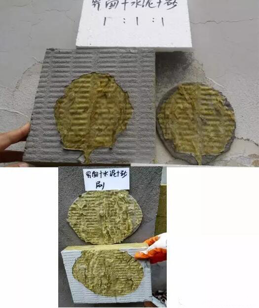 專業(yè)人員曾做過一組對(duì)比試驗(yàn),在墻上粘貼4組巖棉板,包括未涂刷界面劑的、涂覆乳液狀界面劑的、涂覆按照乳液:水泥=1:1界面劑的、涂覆乳液:水泥:混合砂=1:1:1界面砂漿。