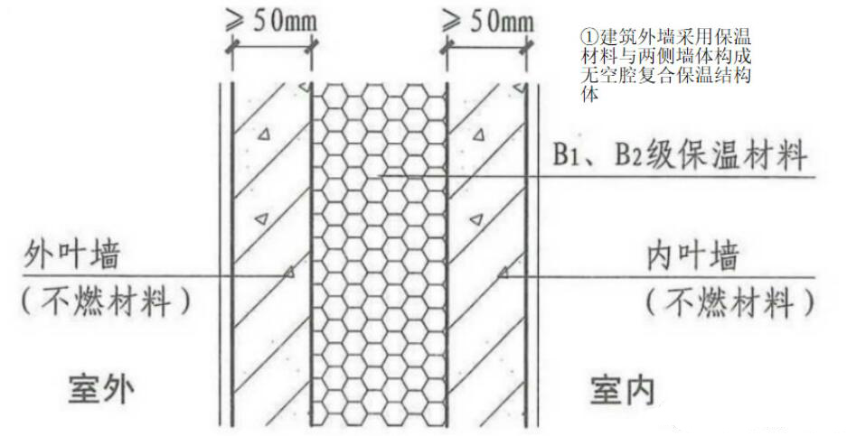 ①是最特殊的,現(xiàn)在應(yīng)用較少的一種情況,保溫材料夾在墻體中間,墻體既有支撐作用又有防護作用要求墻體厚度不小于50mm。采用B1、B2級材料時用A級材料在樓板處進行隔離,高度不小于300mm,防止下一層著火,延保溫層豎向蔓延。就想前面提到的火災(zāi)一樣。