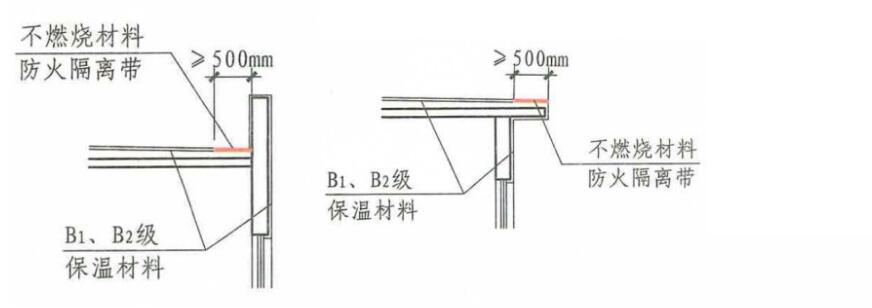 由于屋面保溫材料的火災(zāi)危害較建筑外墻的要小,且當(dāng)保溫層覆蓋在具有較高耐火極限的屋面板上,對建筑內(nèi)部的影響不大,故對其保溫材料的燃燒性能要求較外墻的要求要低些。但為限制火勢通過外墻向上蔓延,要求屋面與建筑外墻的交接部位應(yīng)做好防火隔離處理。當(dāng)屋面板耐火極限較高不低于1.00h,保溫層耐火等級選擇不低于B2級,屋面板耐火等級低于1.00h,保溫層耐火極限要選擇相對較高的不低于B1級。防護層和內(nèi)保溫一樣厚度不小于10mm。