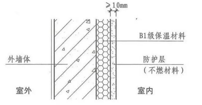 建筑內(nèi)保溫人密(人多,發(fā)生火災(zāi)不利于疏散),用火油氣(火災(zāi)危險性大的場所),疏散通道(著火了要從這些地方跑或避難)采用A級;其他B1級并且因為是室內(nèi)如果產(chǎn)生有毒煙氣會造成人員傷亡要求低煙低毒。下圖為內(nèi)保溫采用B1級材料時,防護層設(shè)置示意圖。
