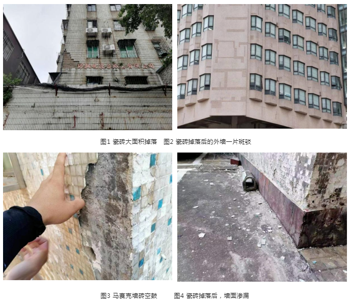 瓷磚脫落一方面有礙觀瞻,就像墻面得了 “牛皮癬”一樣,看上去特別不舒服;另外,瓷磚脫落容易砸傷行人和車輛,危及樓下行人的生命安全,給社會(huì)公共安全造成較大危害。此外,瓷磚脫落,時(shí)間長了會(huì)引發(fā)墻體開裂,造成室內(nèi)墻體滲漏,墻面裝飾涂料或者墻紙發(fā)生起皮、脫落和霉變現(xiàn)象,給居民生活帶來諸多不便,而且維修起來費(fèi)時(shí)費(fèi)力費(fèi)錢,成為不少居民的“心頭病”。圖1—4為海口市老小區(qū)外墻瓷磚空鼓、脫落情況。