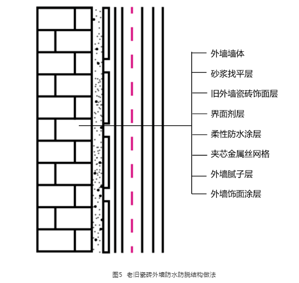 針對老舊小區(qū)外墻脫落問題,筆者公司研發(fā)了一種老舊瓷磚外墻防水防脫施工工藝,該工藝已經(jīng)在海南省舊改外墻項(xiàng)目大量應(yīng)用,均取得較好的施工效果,也申請了國家知識產(chǎn)權(quán)局的“實(shí)用新型專利”。該老舊瓷磚外墻防水防脫結(jié)構(gòu)做法見圖5。